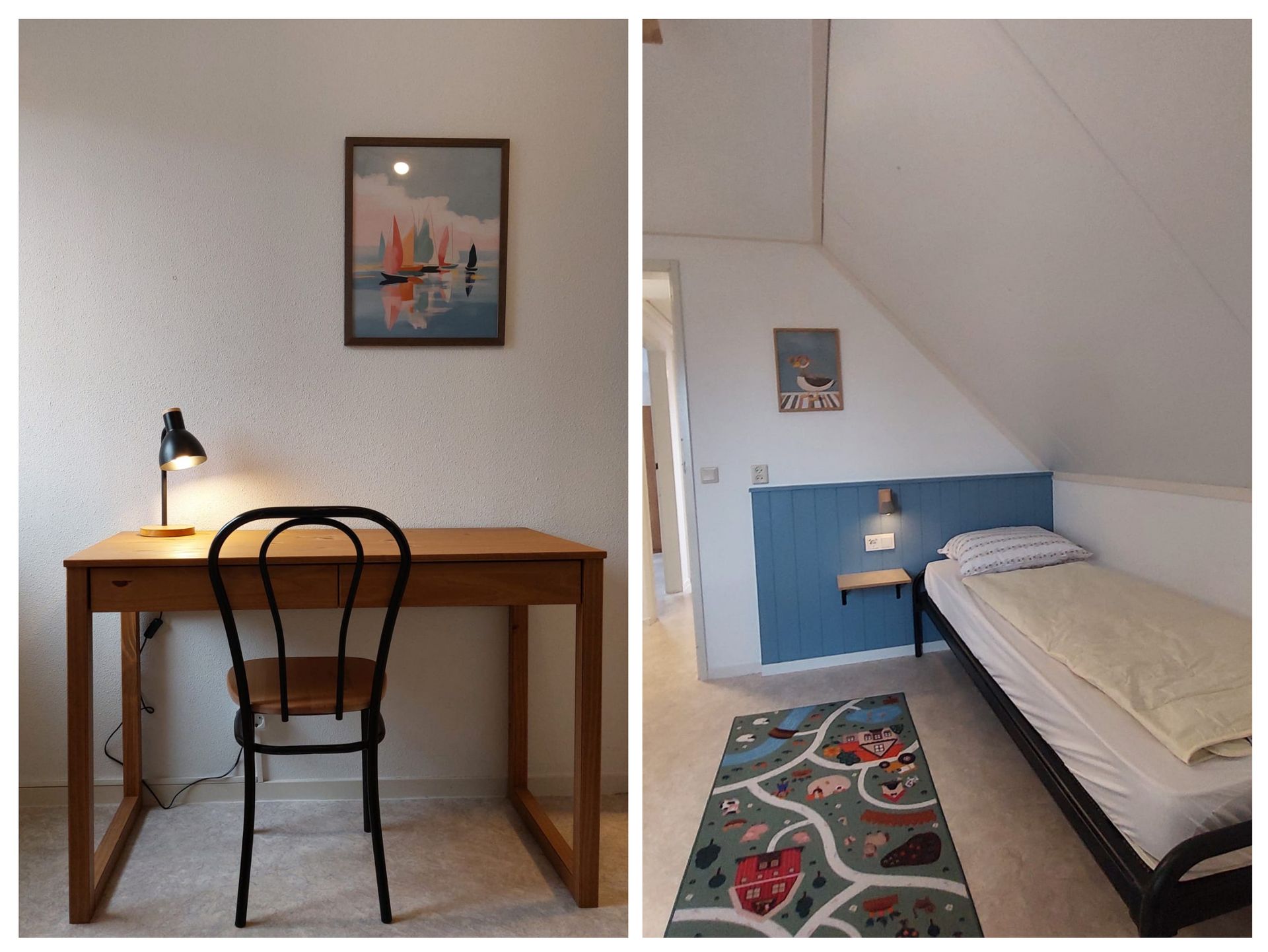 Im Erdgeschoss erwartet euch ein offener Wohn- und Küchenbereich mit angrenzendem Gäste-WC und Abstellraum. Große Fenster öffnen den Blick in den Garten und direkt ans Wasser. Im Obergeschoss befinden sich drei Schlafzimmer – zwei mit Doppelbett und eins mit Einzelbett (80x190) – sowie ein Badezimmer mit Dusche und WC.